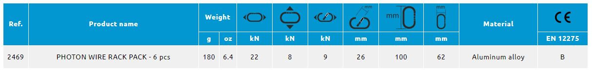 CAMP Photon Wire – остается одним из самых легких карабинов в мире и по-прежнему значительно больше других карабинов в своем классе. В новом поколении изменен дизайн профиля и "носика" карабина, что на 1 kN увеличило прочность при сохранении веса по сравнению со старой моделью карабина, а новая запатентованная защелка SphereLock существенно облегчает вщелкивание и выщелкивание карабинов из анкерных точек.