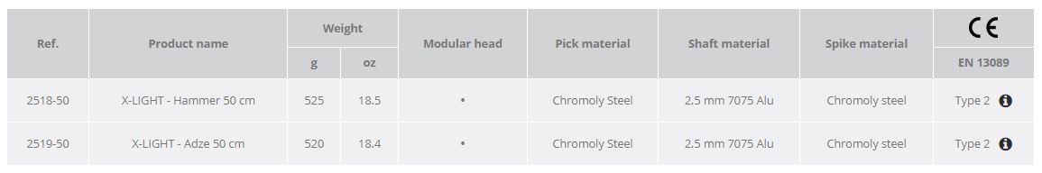 - Клюв (тип Т) их хромированной стали и рукоятка (тип Т) из алюминиевого сплава 7075-T6 (CE-UIAA тип 2)