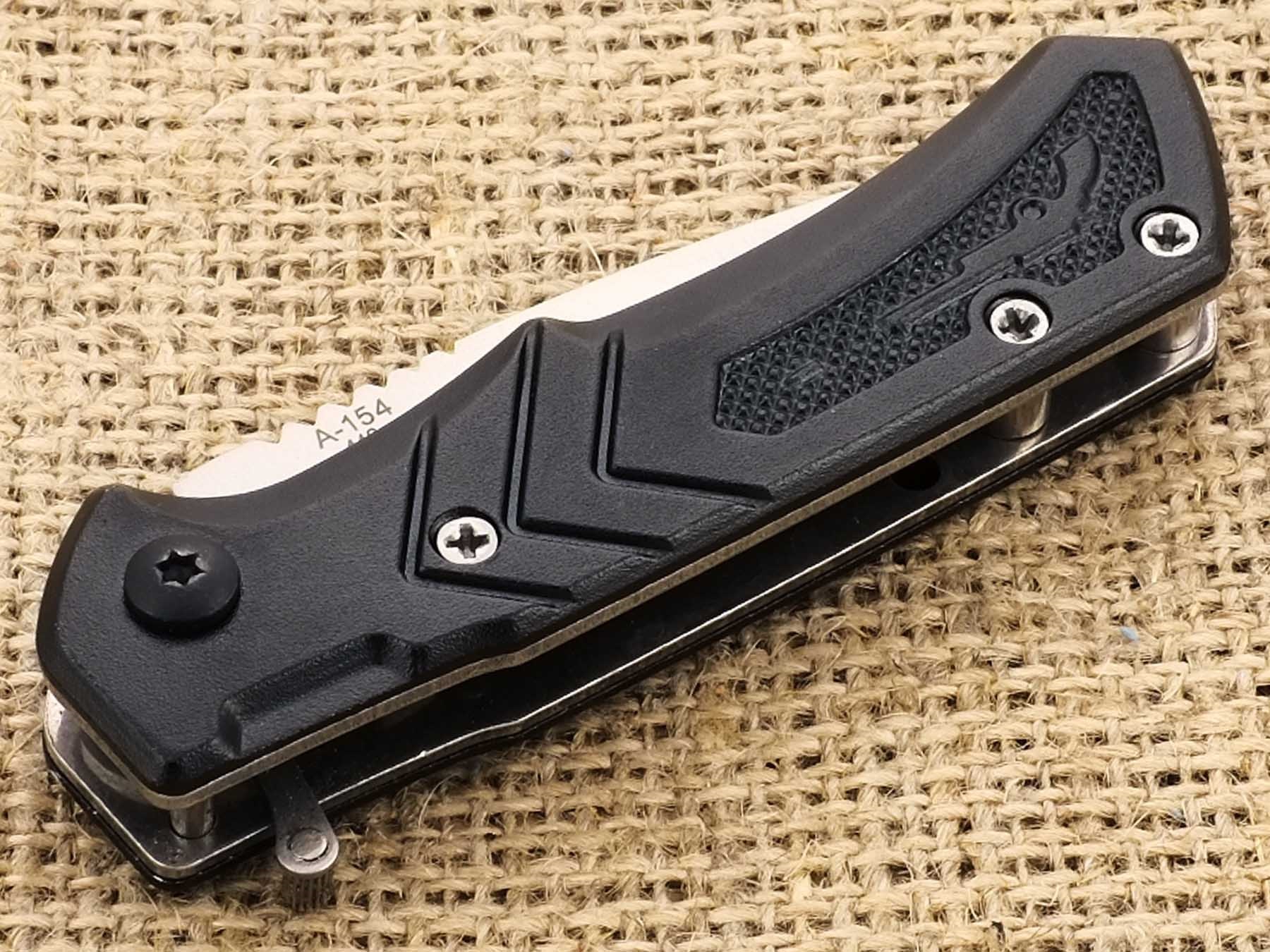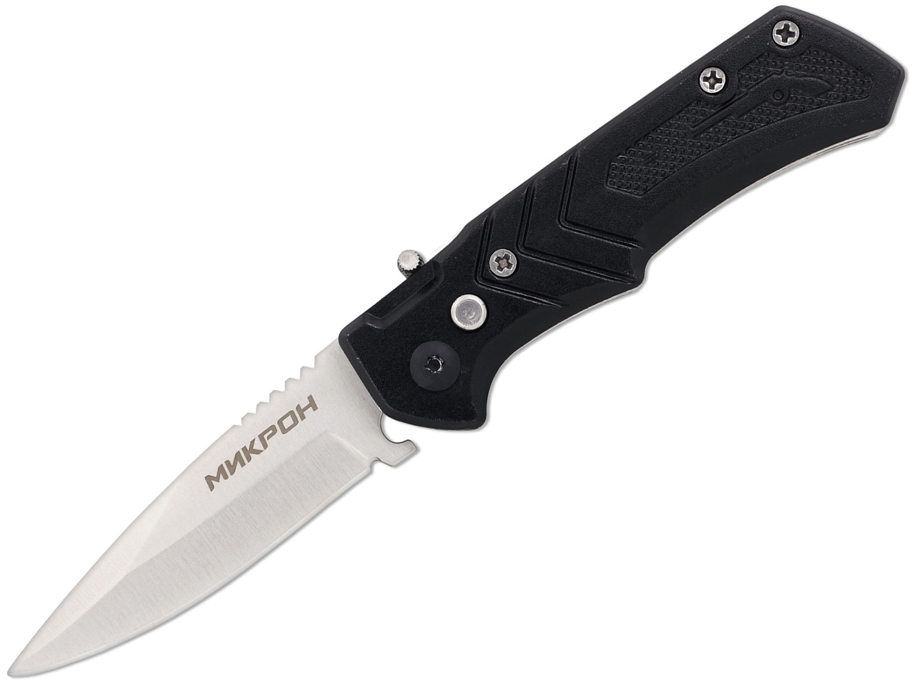 В данном изделии используется замок button lock – его механизм отличается простотой и надежностью. Рукоятка ножа Микрон A-154 металлическая, на поверхность рукоятки нанесен фактурный рисунок. Два подпальцевых выступа на рукоятке делают удержание ножа максимально комфортным.