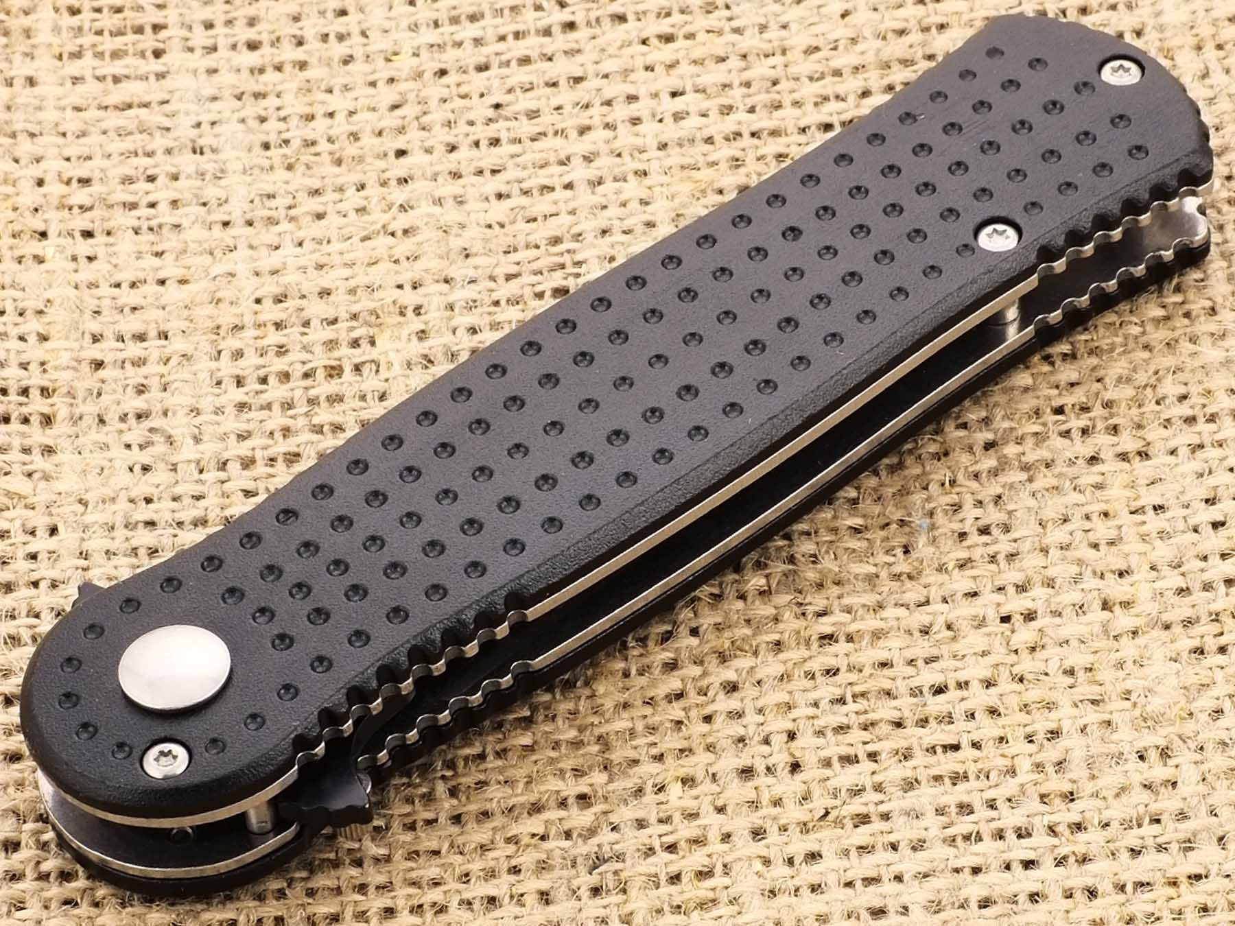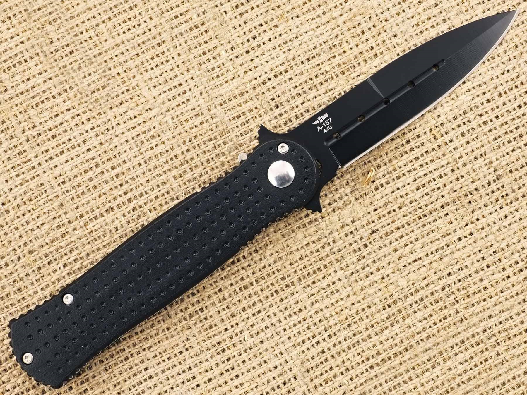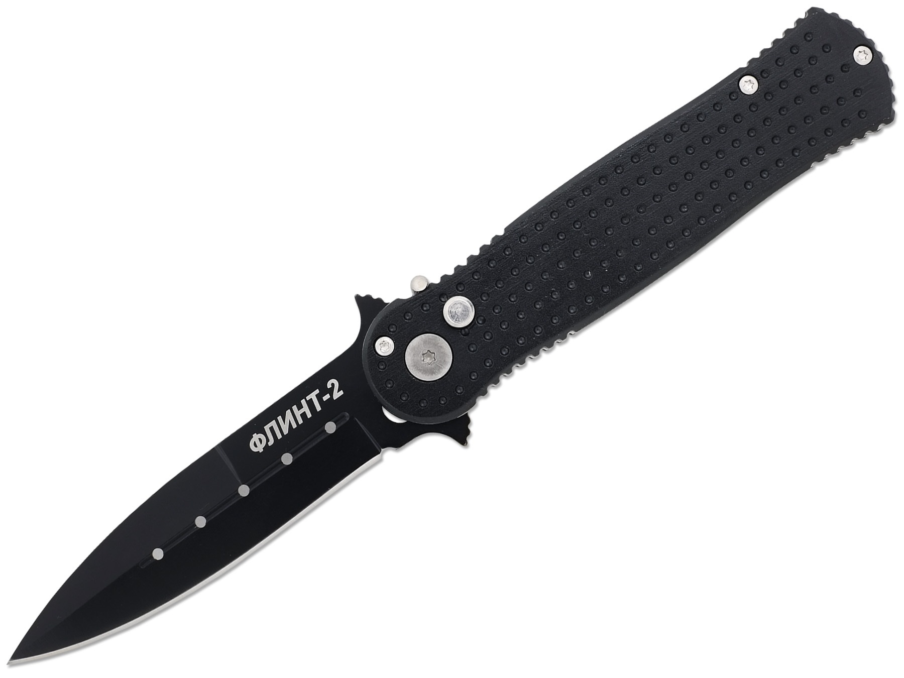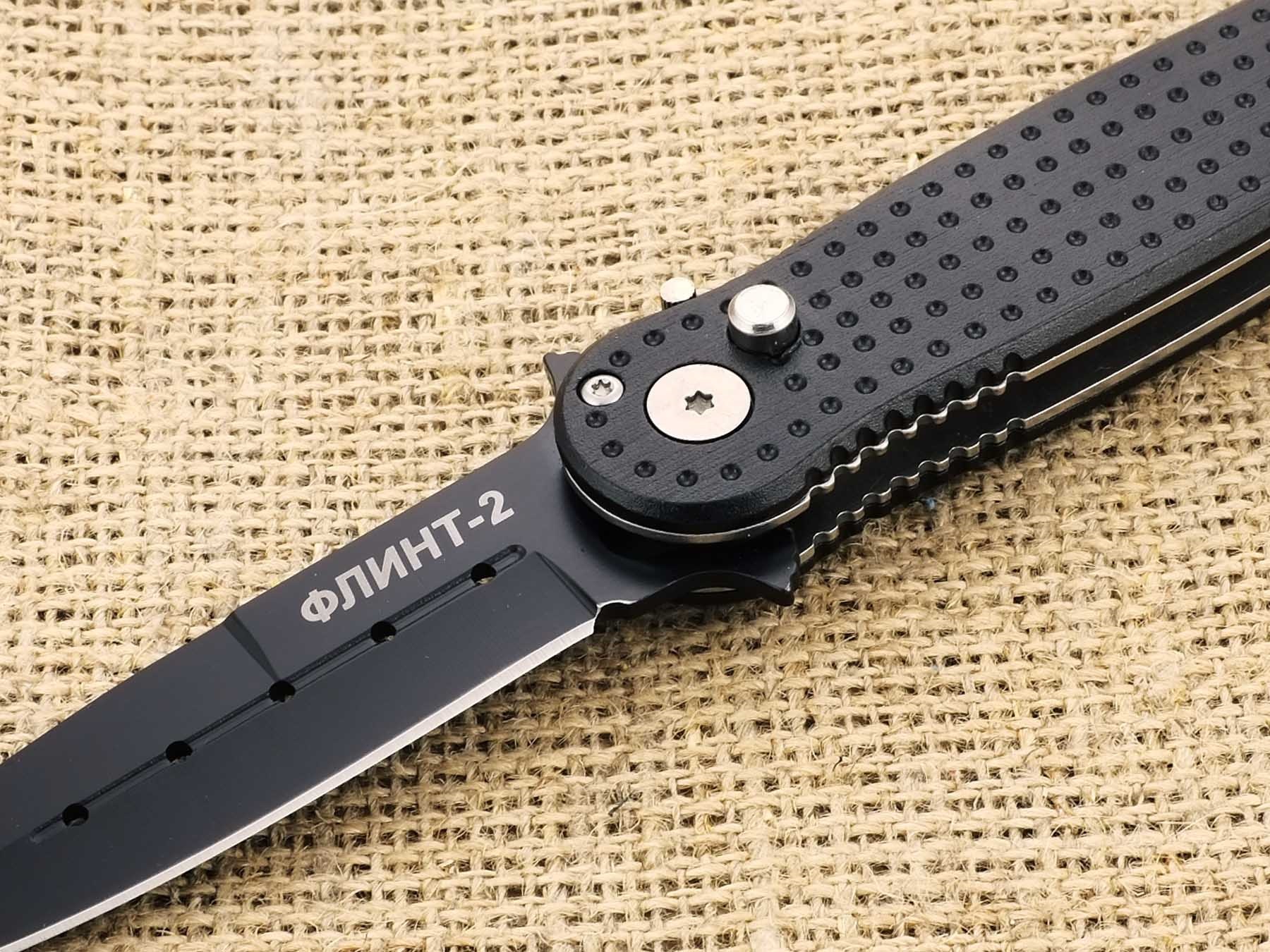 Нож Флинт-2 A-157 имеет запорный механизм button lock, здесь клинок фиксируется кнопкой на больстере рукоятки, а извлечение клинка производится надежным пружинным механизмом. Материал рукоятки – металл, ее поверхность имеет рельефный узор.