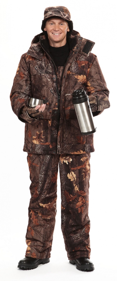 Камуфлированный универсальный костюм для охоты, рыбалки и активного отдыха при низких температурах. Состоит из удлиненной куртки и полукомбинезона.Куртка: