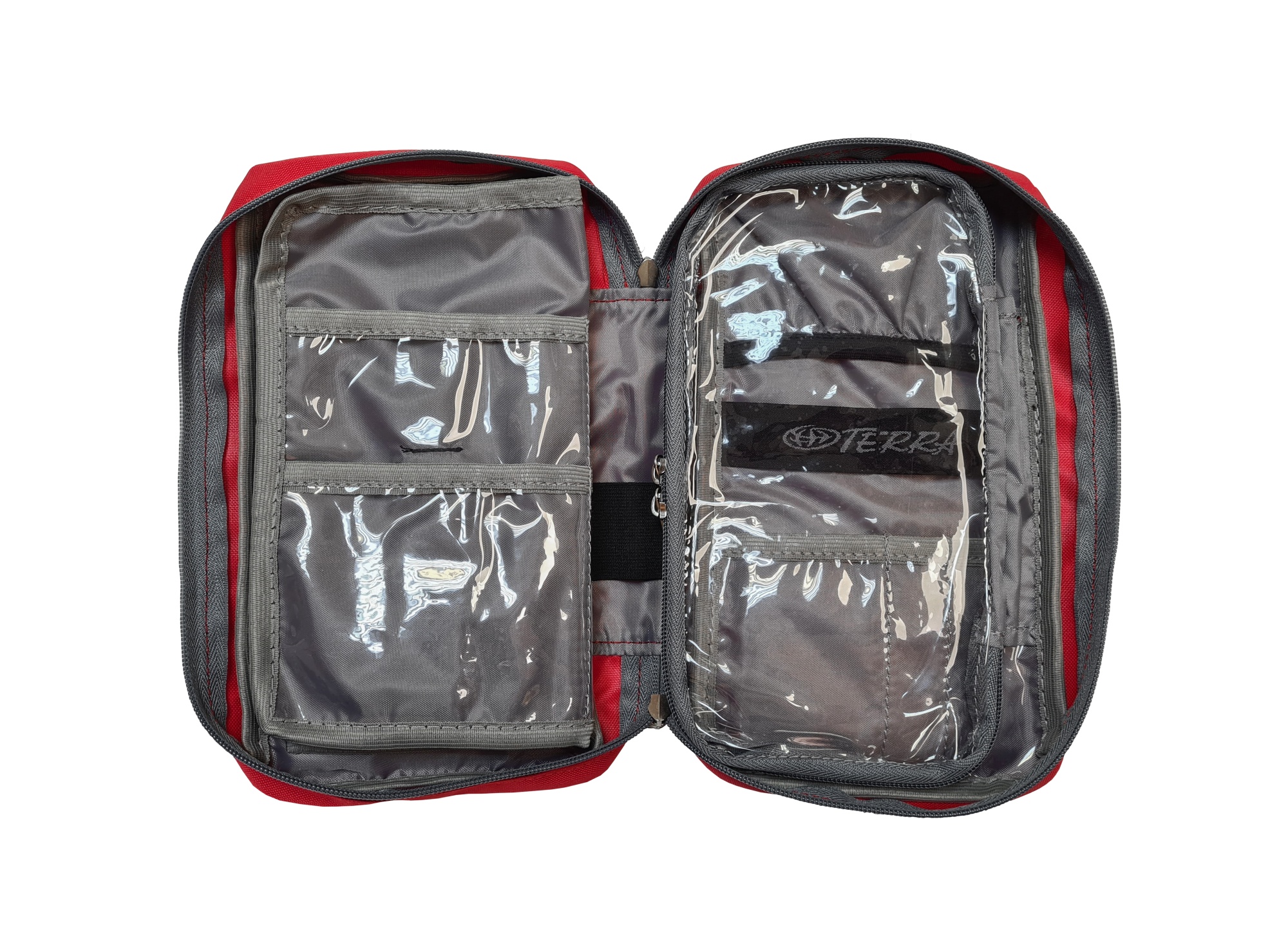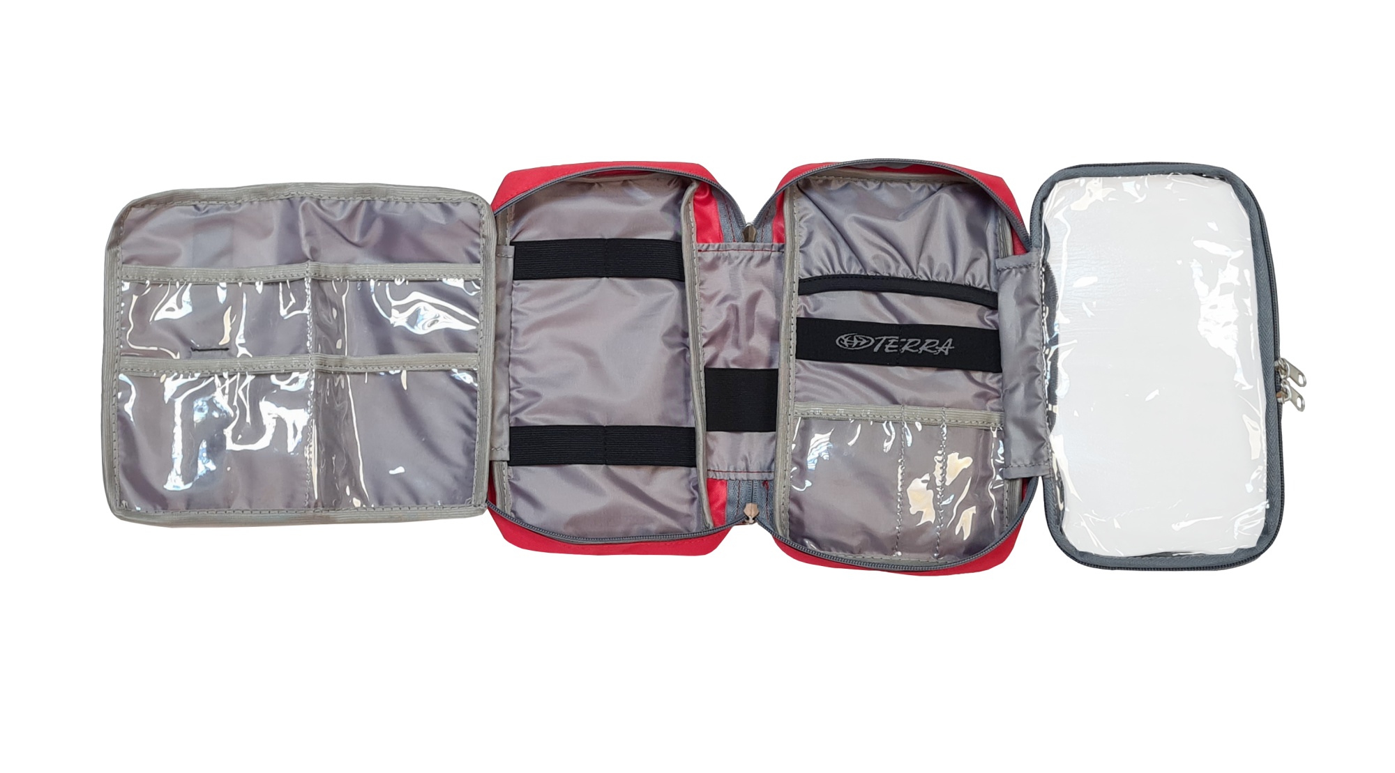 Аптечка удобно раскладывается, имеет множество кармашков внутри, молнию по периметру,основную ручку и петли для крепления на пояс. Амортизирующие прокладки внутри стенок аптечки уберегут хрупкие предметы при падении аптечки.