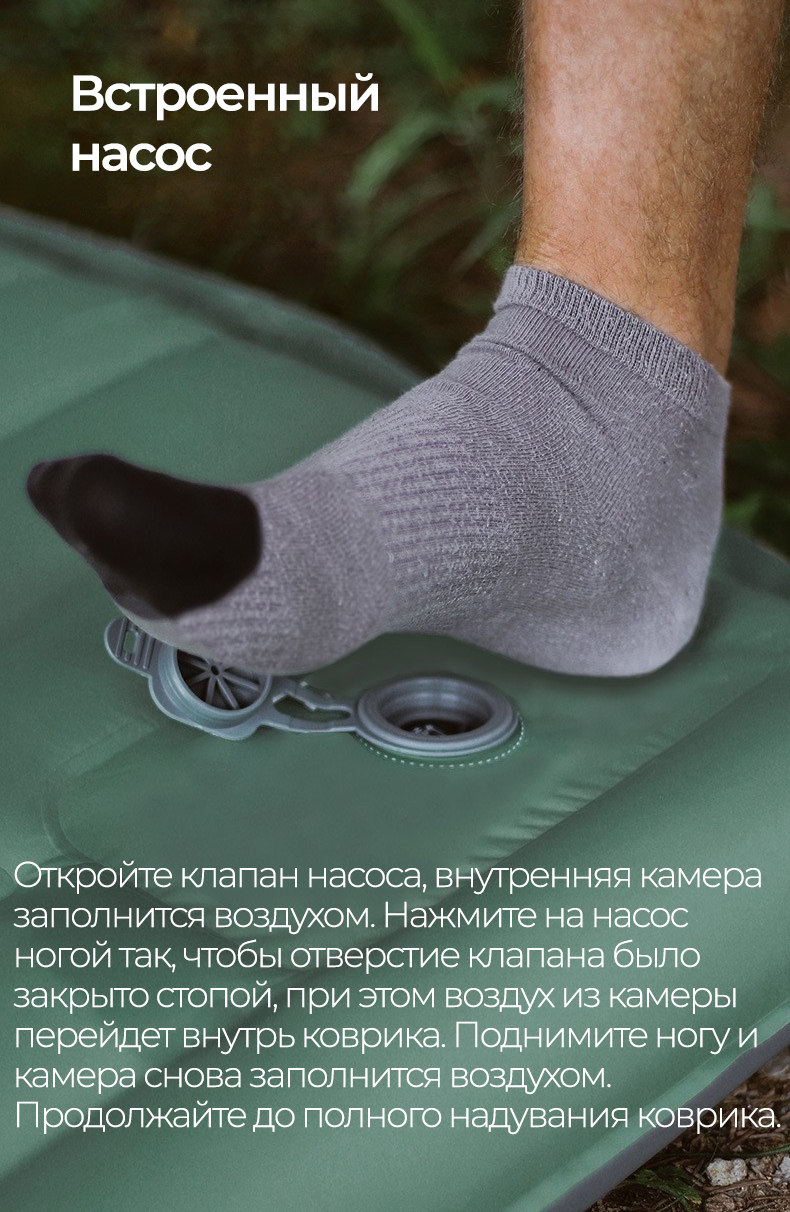Распакуйте и снимите стягивающие ремни с ковра. Расправьте его и откройте клапан насоса, внутренняя камера которого заполнится воздухом. Нажмите на насос ногой так, чтобы отверстие клапана закрылось стопой, при этом воздух из камеры перейдет внутрь коврика. Поднимите ногу и камера снова заполнится воздухом. Продолжайте до