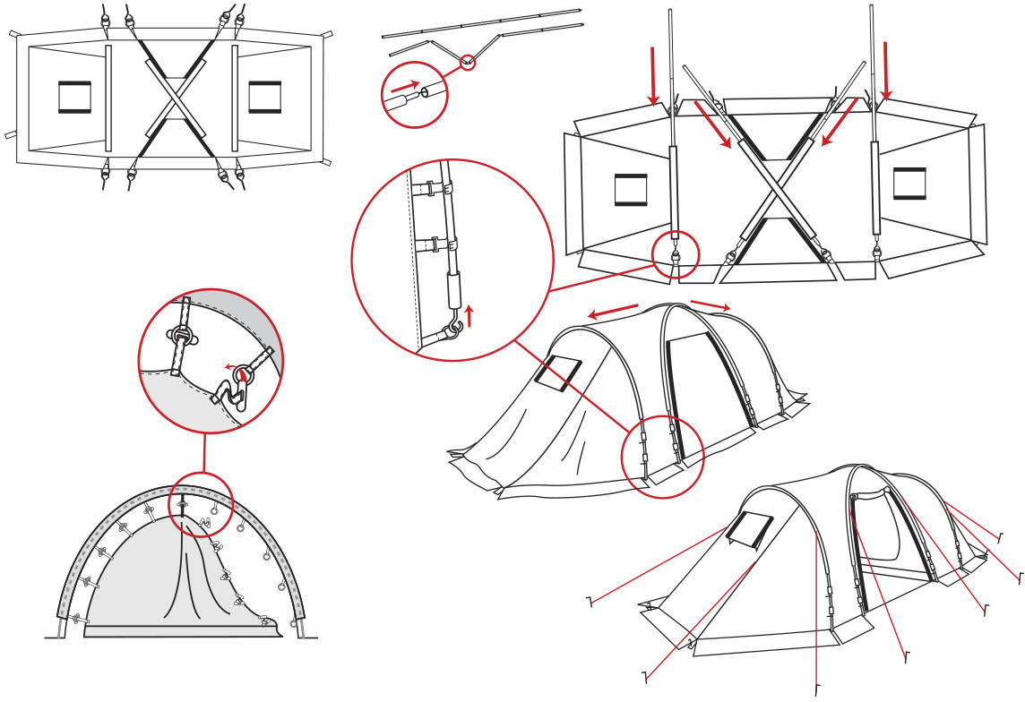 - Петли на тенте и оттяжки внутренней палатки промаркированы одним цветом.