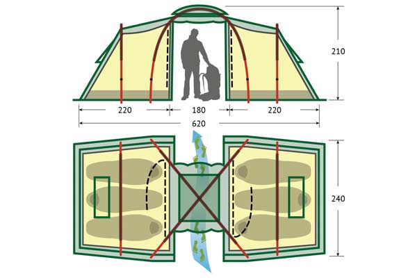 - Два входа в палатку с дополнительными антимоскитными сетками.