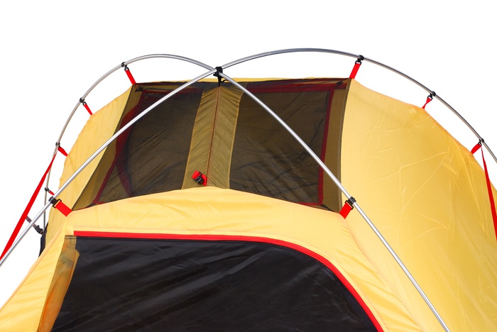 Два входа во внутреннюю палатку закрываются тканевым пологом и москитной сеткой и маркируются цветом молнии. Открытые пологи входа можно свернуть и зафиксировать баклей. При полностью закрытом входе внутренняя палатка надежно защищает от пауков, комаров, змей и муравьев. Для эффективной вентиляции в верхней точке купола сделано сетчатое вентиляционное окно. Под окном расположена полочка для мелких вещей. Над полочкой вшито пластиковое кольцо для фонарика. Ближе к коробу пола вдоль стен расположены вместительные карманы для легких вещей.