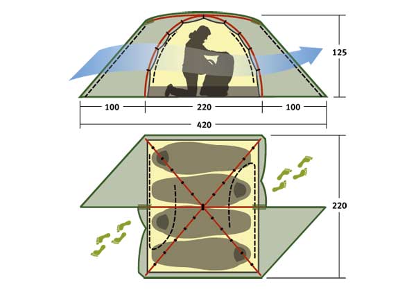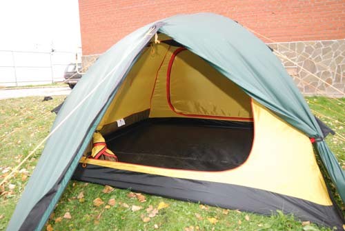 По краю внешнего тента на большую глубину вшиты боковые оттяжки. Оттяжки вшиваются в усиления на тенте, чтобы не разрушить ткань. Они сделаны из эластичного шнура, что позволяет уменьшить нагрузку на фиксирующий колышек при ветре и компенсировать натяжение при намокании тента. Угловые оттяжки сделаны из прочных стрепов и регулируются по длине. Внешний тент крепится к каркасу и внутренней палатке надежными фастексами Nexus и липучками Velcro. Внутренняя палатка с помощью оттяжек с пластиковыми крючками она растягивается на алюминиевых дугах каркаса. Время сборки не более минуты. Дуги каркаса эластичные, прочные, диаметром 8.5 мм, сделаны из алюминия 7001 Т6. По боковым сторонам внутренней палатки натянута стропа, которая не дает соприкасаться внешнему и внутреннему тенту даже в сильный ветер, что спасает от проникновения конденсата.