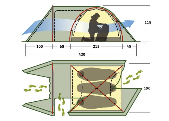 - Стропа между тентом и палаткой не дает тенту соприкоснуться с внутренней палаткой в сильный дождь и ветер