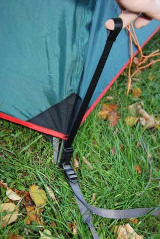 - Регулируемая оттяжка позволяет оптимально растянуть дно палатки без перетыкания (как обычно) колышков
