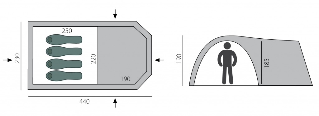 - Двухслойная кемпинговая палатка с четырьмя входами, большим тамбуром