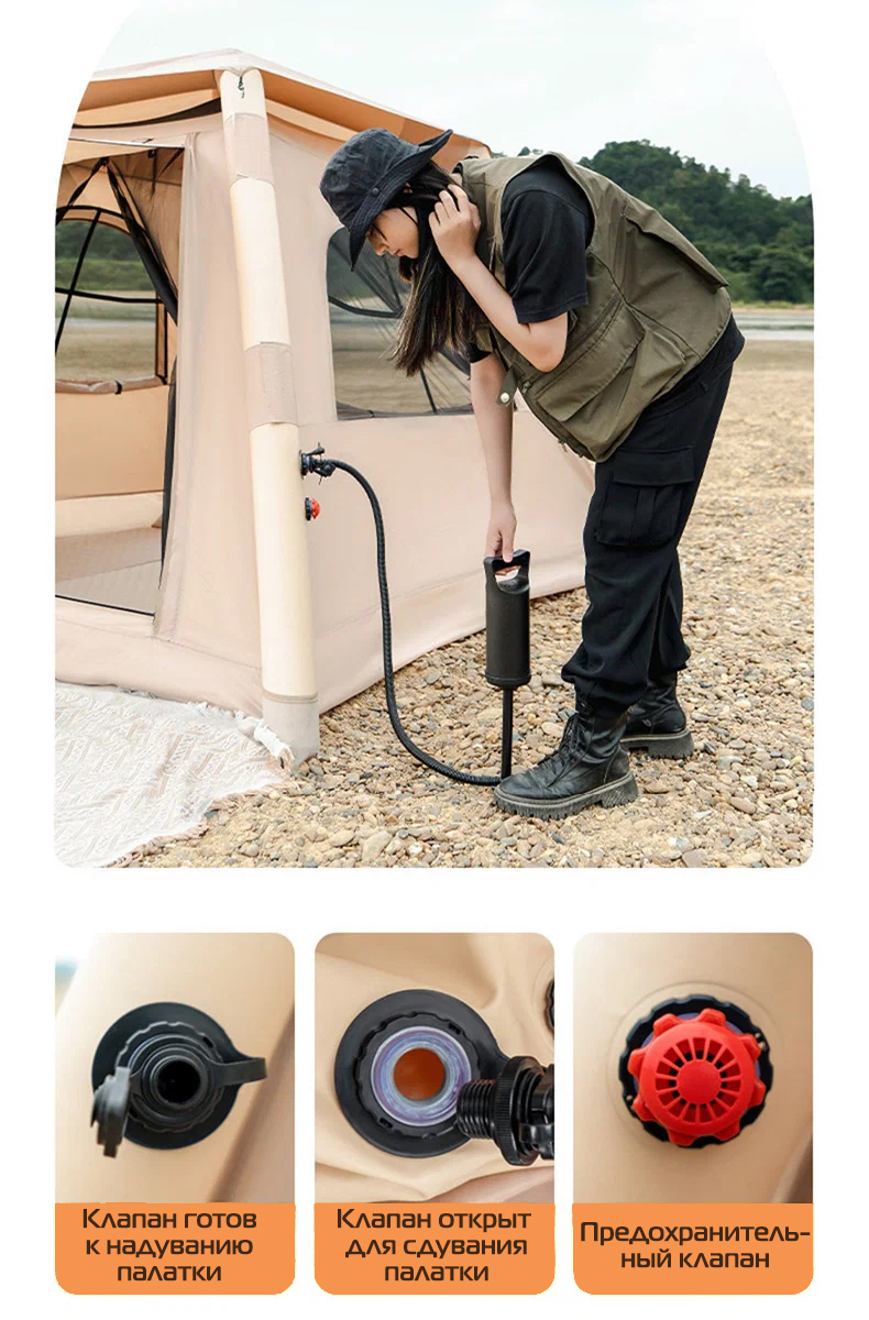 Комплектация: Палатка, ручной насос, колышки, оттяжки, стойки для навеса