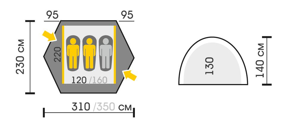 • Размер палатки – 310х230х140 см.
