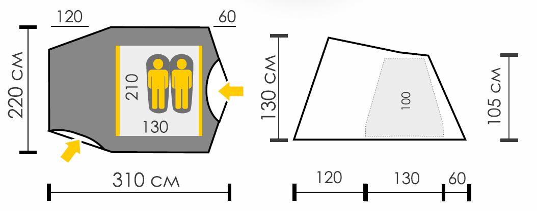 • Москитные сетки, дублирующие основные двери на входах во внутреннюю палатку, в полный размер двери.