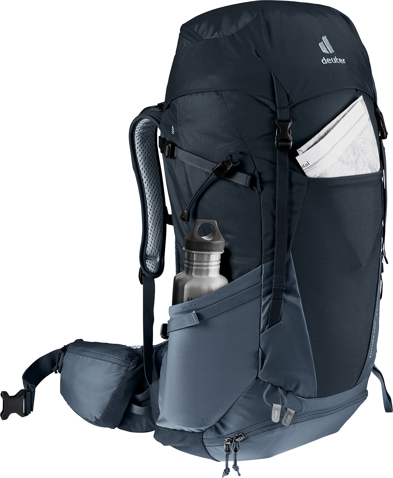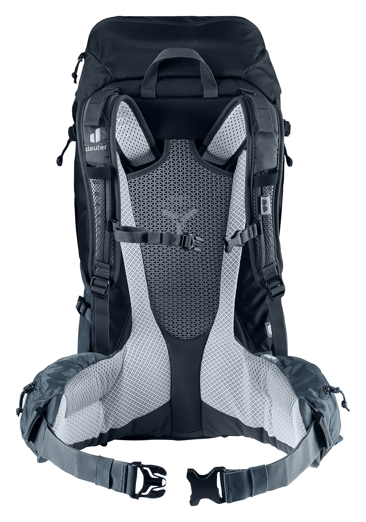 - Deuter Aircomfort Sensic Pro - гибкий подпружиненный каркас обеспечивает равномерное натяжение сетчатого материала спинки рюкзака и создаёт пространство для вентиляции между рюкзаком и спиной, в результате значительно снижается потоотделение, что уменьшает нагрузку на организм и повышает выносливость
