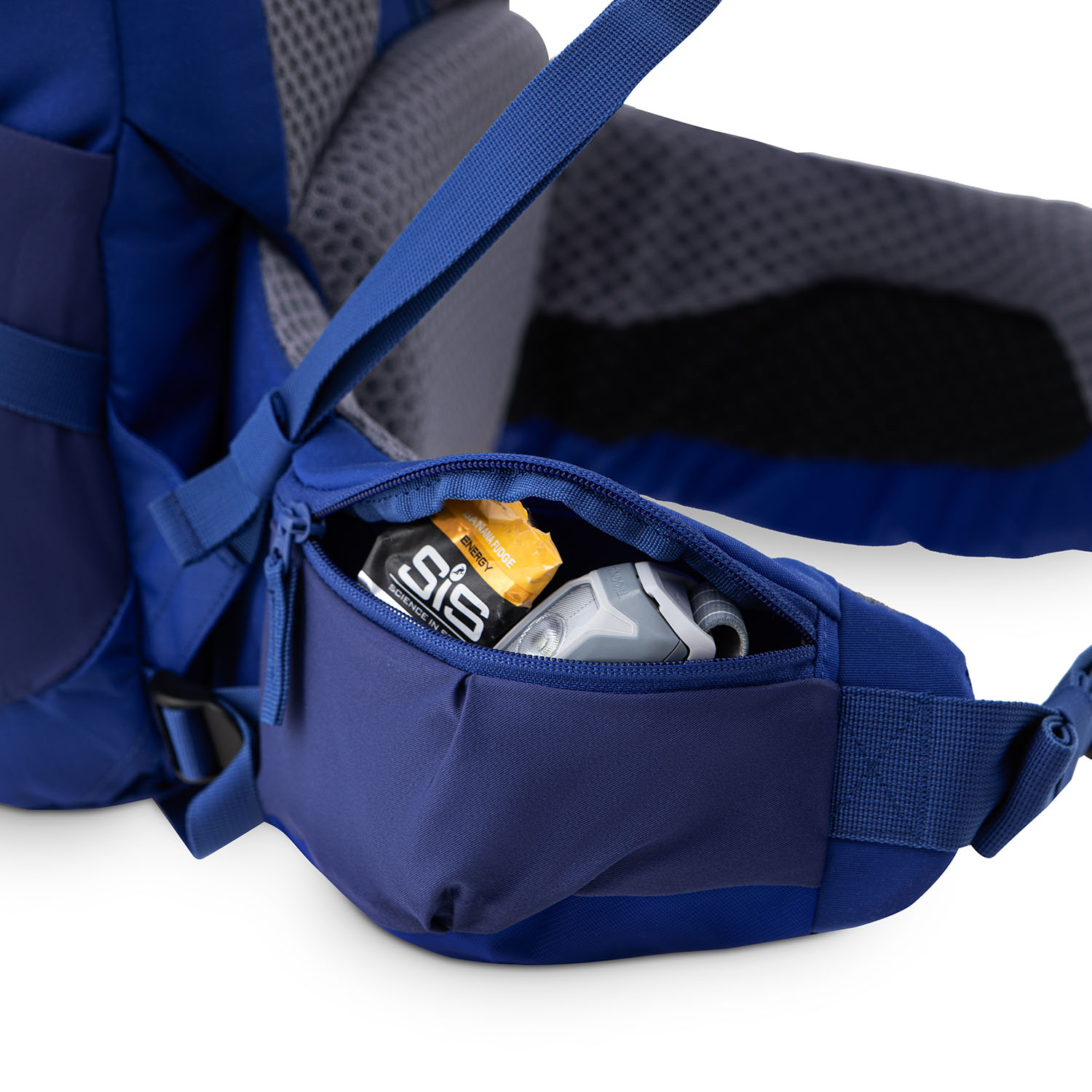- Два кармана на поясном ремне вместят нужные в походе мелочи, например, бальзам для губ, солнцезащитный крем, перекус, пауэрбанк или налобный фонарь.