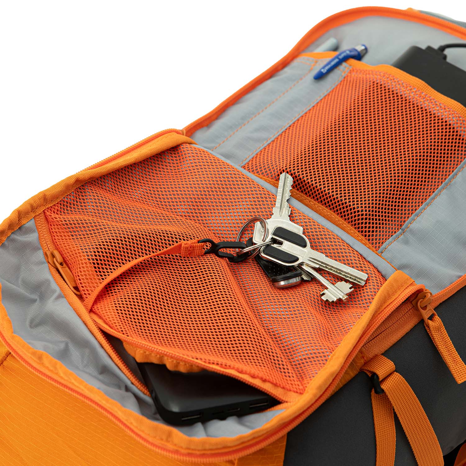 - Карман-органайзер для мелочей с отделениями для смартфона, пауэрбанка и с карабином для ключей.