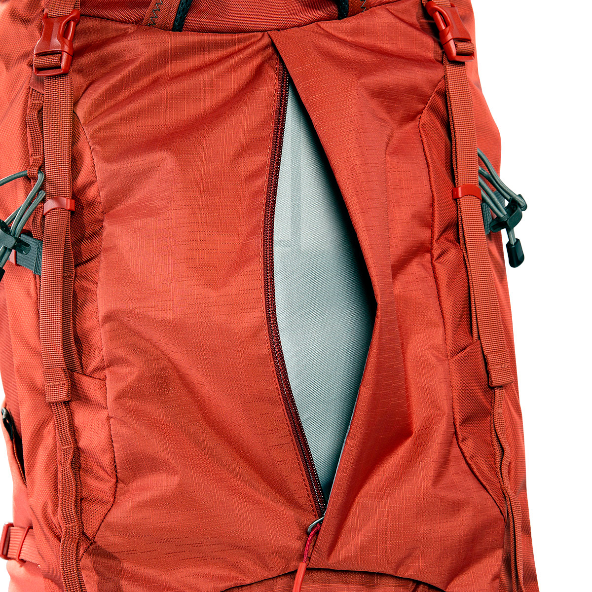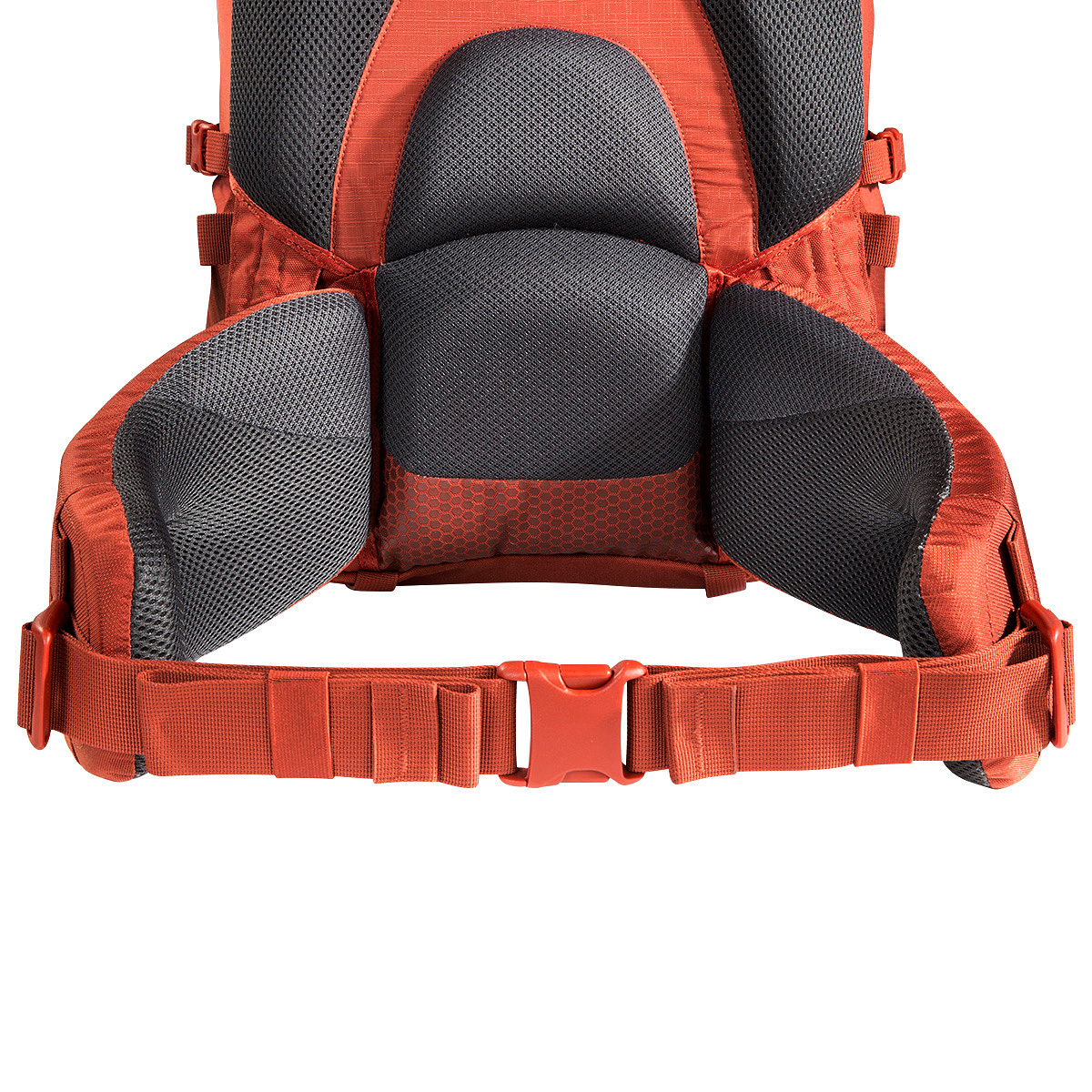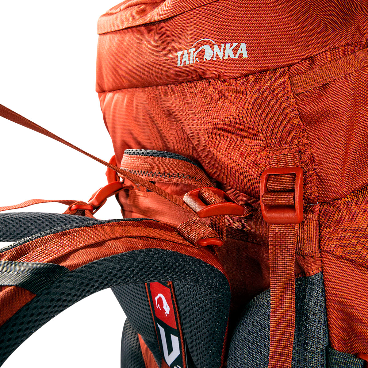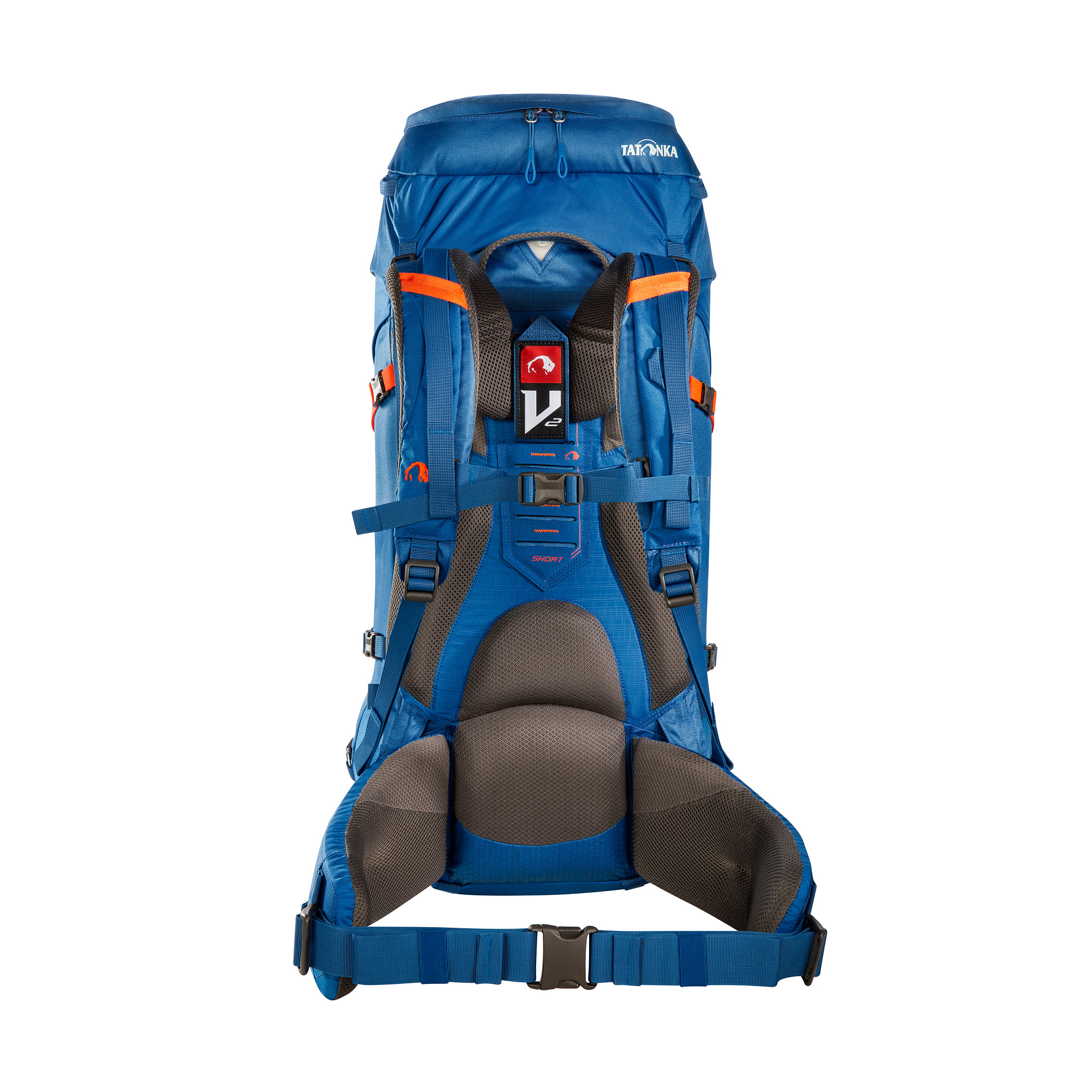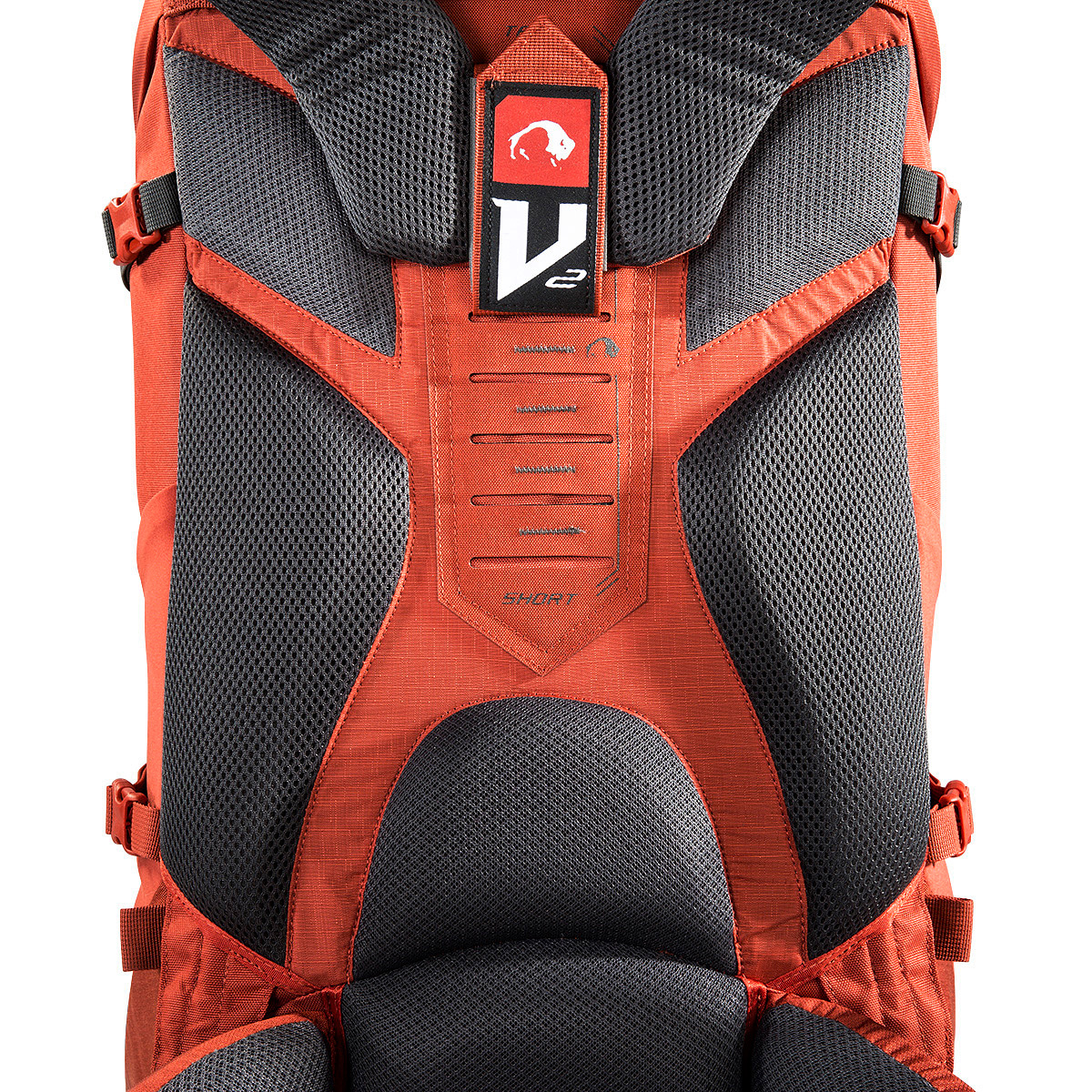 В рюкзаках Tatonka Yukon используется система подвески V2. Её основная задача - эффективно перераспределить 70-80% всей массы рюкзака на трехсекционныйэргономичный набедренный ремень при помощи рамы из двух алюминиевых шин в виде перевернутого «V» и двух коротких стержней из стекловолокна. Это значительно уменьшает нагрузку на позвоночник и понижает центр тяжести системы, что улучшает устойчивость при передвижении. Остальные 20-30% приходятся на плечевые ремни анатомической формы с возможностью регулировки под различный рост. Регулировочные ремни могут быть зафиксированы в двух различных положениях для индивидуального распределения нагрузки на плечевые лямки при помощи стропы регулировки натяжения лямок. Вентиляция спины осуществляется за счет воздушных каналов и использования материала Air Tex по всей площади спины и ремней. Эргономичный набедренный пояс состоит из центральной подушки для поясницы с не скользящей вставкой и двух конусообразных набедренных крыльев с многослойной мягкой прокладкой, усиленной полиэтиленовой пластиной. Посадка набедренного пояса удобно регулируется при помощи гибкой системы затяжек. Крышка рюкзака также регулируется по высоте.