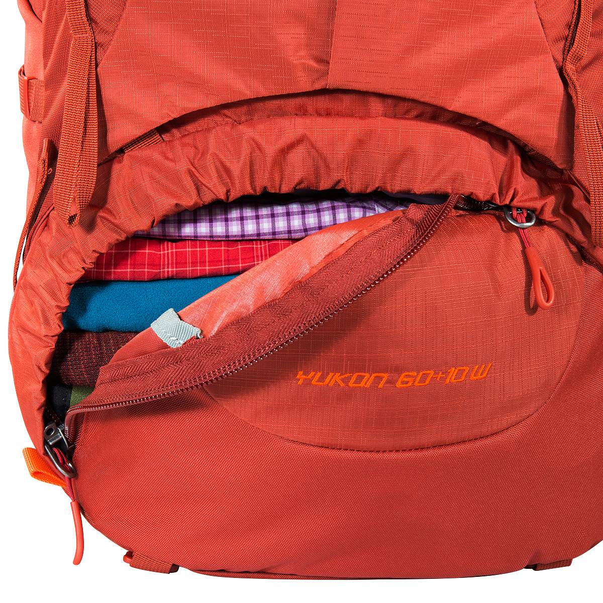 Tatonka Yukon 60+10 Women оснащен крышкой с внешним и внутренним карманами. Во внешнем кармане расположен дождевой чехол для рюкзака и крючок для ключей, а внутренний карман промаркирован для хранения аптечки или лекарств. В рюкзаке 2 отделения, верхнее и нижнее, которые разделены между собой тканевой перегородкой. При необходимости оба отделения можно объединить в одно большое, расстегнув молнию по периметру перегородки. В основное отделение можно попасть при помощи верхнего утягивающегося клапана-тубуса и 3D входа на молнии спереди, что облегчает доступ к вещам. Доступ в нижнее отделение возможен через клапан на молнии.