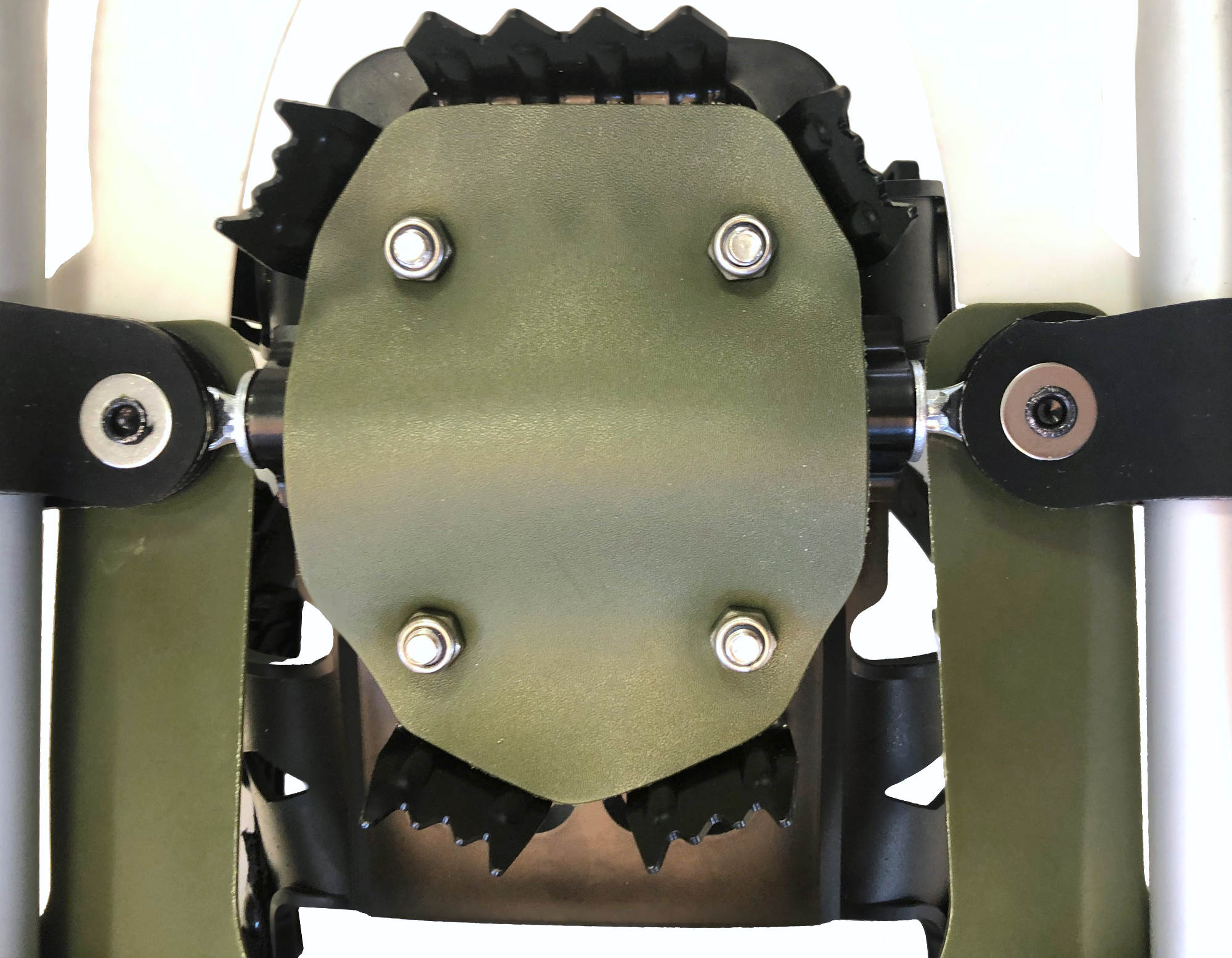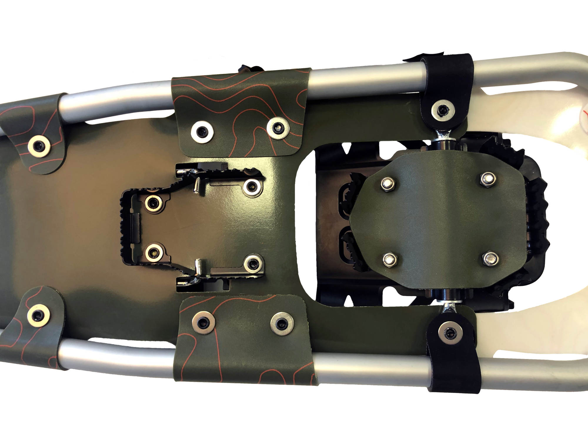 • Технология Heel Rising: Снегоступы имеют подпяточник – конструкцию, обеспечивающую, при необходимости, подъём пятки, для наиболее удобного совершения подъёма в гору, холм и т.д. Конструкция складываемая. В базовом положении, при равнинной ходьбе, подпяточник сложен и равен поверхности зоны пятки на полотне