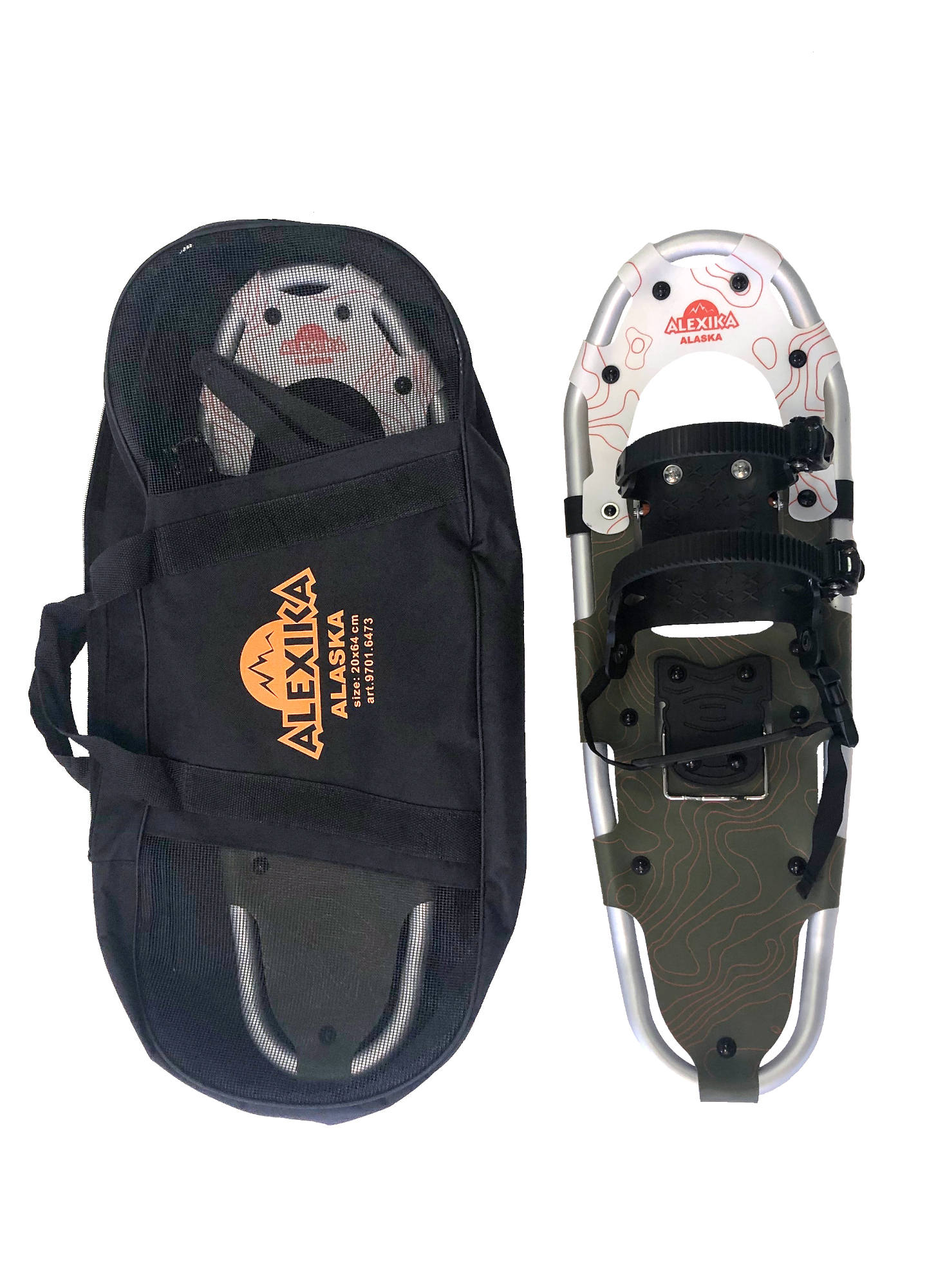 • Сумка: Пара снегоступов поставляется с удобной сумкой для транспортировки и хранения снегоступов. Сумка имеет сетчатые зоны для свободного выхода снега или влаги, что позволяет уложить в них снегоступы сразу после эксплуатации. Сумка выполнена из нейлона плотностью в 600 денье и имеет удобную ручку для транспортировки