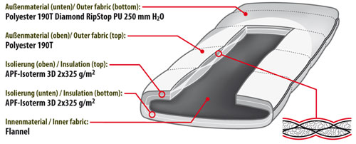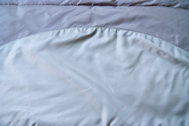 Большие потери тепла могут возникать если спальник намокает от конденсата. Поэтому капюшон, вся область спины и ног сшита из влагонепроницаемой (внешняя сторона ткани обработана пропиткой WR (water repellent), а с внутренней части покрыта слоем полиуретана с водонепроницаемостью 250 мм водного столба) и высокопрочной (для усиления ткани без большого увеличения веса вплетена более толстая и прочная нить с равномерным шагом по вертикали и горизонтали - это технология RipStop) и не продуваемой ткани (более темного цвета). Центральная часть спальника (светлая ткань) сделана из паропроницаемой ткани, что позволяет спальнику "дышать", выпускать пар и не конденсировать влагу внутри.