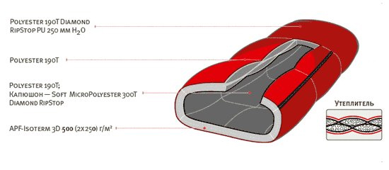 Под тканью расположены два слоя утеплителя APF Isoterm 3D по 250 г/м2 на каждый слой (всего 500 г/м2). Это более чем достаточно для удержания тепла даже при -12 С. Утеплитель APF Isoterm 3D представляет собой самое современное вспушенное волокно, имеющее пространственную структуру 3D с воздушными каналами и силиконовым покрытием для уменьшения сваливания волокон и предотвращения впитывания влаги. Утеплитель сформирован в пакеты, смещенные относительно друг друга на половину ширины пакета для перекрытия «холодного шва». Пакеты утеплителя производятся из не тканного легкого и паропроницаемого материала, который уменьшает потери на конвекцию.