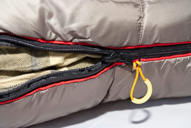 Нижняя часть спальника и область ног (более темного цвета) сшита из не продуваемой, влагозащитной и прочной ткани, усиленной плетением RipStop (ткань усилена толстой и прочной нитью в горизонтальном и вертикальном направлении с шагом в 2 мм). С внешней стороны материал обработан пропиткой WR (water repellent), а с внутренней стороны покрыт слоем полиуретана с водонепроницаемостью 250 мм водного столба. Центральная часть спальника (светлая ткань) сделана из паропроницаемой ткани,что позволяет спальнику "дышать", выпускать пар и не конденсировать влагу внутри. Следующим слоем после ткани идет синтетический утеплитель APF Isoterm 3D - вспушенное волокно с воздушными каналами и силиконовым покрытием для уменьшения сваливания волокон и предотвращения впитывания влаги. Двухслойный утеплитель сформирован в пакеты, смещенные относительно друг друга на половину ширины пакета, что позволяет значительно сократить потери тепла через швы. Если вам холодно, затяните шнуры затяжки вокруг плеч, и тепло не покинет вас.