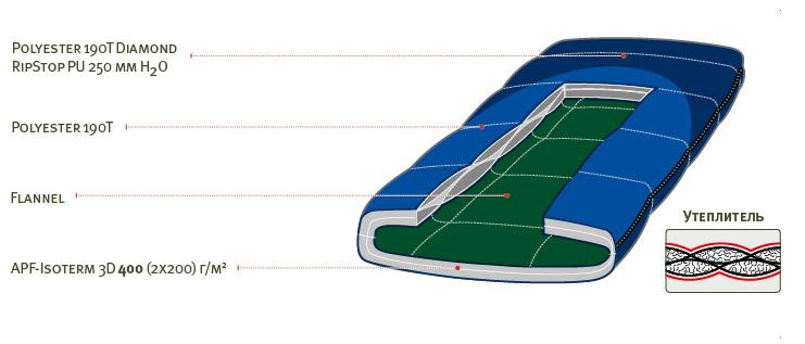 Капюшон, вся область спины и ног сшита из влагонепроницаемой (внешняя сторона ткани обработана пропиткой WR (water repellent), а с внутренней части покрыта слоем полиуретана с водонепроницаемостью 250 мм водяного столба) и высокопрочной (для усиления ткани без увеличения веса вплетена более толстая и прочная нить с равномерным шагом по вертикали и горизонтали - технология RipStop) и не продуваемой ткани (более темного цвета). Центральная часть спальника (светлая ткань) сделана из паропроницаемой ткани, что позволяет спальнику "дышать", выпускать пар и не конденсировать влагу внутри. Под тканью расположены два слоя утеплителя APF Isoterm 3D по 200 г/м2 на каждый слой (всего 400 г/м2) - это очень солидное количество утеплителя. Утеплитель APF Isoterm 3D представляет собой самое современное вспушенное волокно с воздушными каналами и силиконовым покрытием для уменьшения сваливания волокон и предотвращения впитывания влаги. Слои сформированы в пакеты, смещенные относительно друг друга на половину ширины пакета, что позволяет значительно сократить потери тепла через швы. Имея два спальника с правой и левой боковой молнией можно состегнуть их и сделать один вместительный спальный мешок на 2-3 человека.