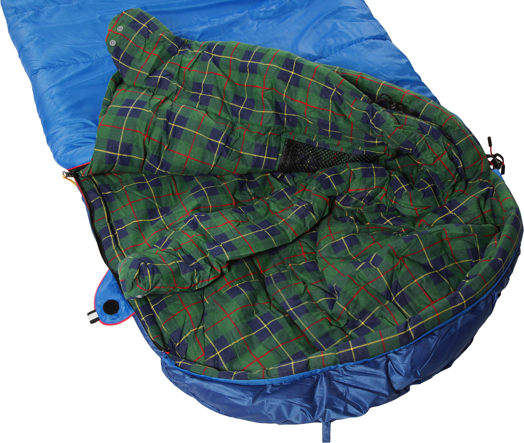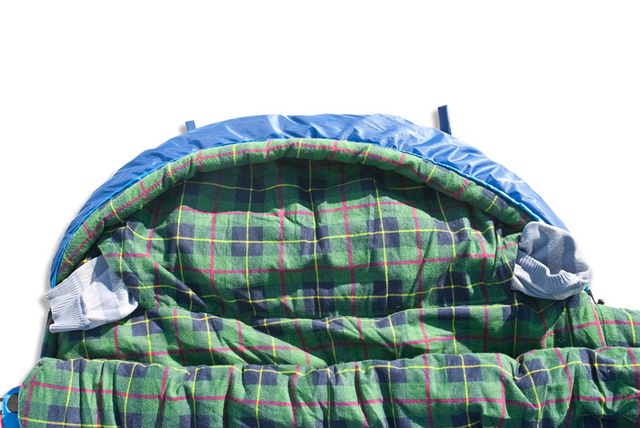 Внутри спального мешка вашей кожи будет касаться шелковистая 100% хлопковая фланель. В капюшоне сделано специальное отделение с двумя отверстиями. Просовываете руку и втягиваете мягкую кофту в отделение. Эта подушка никогда от вас не убежит. При расстегивании спальника вы получаете большое одеяло размером 1.95х1.8 метра.