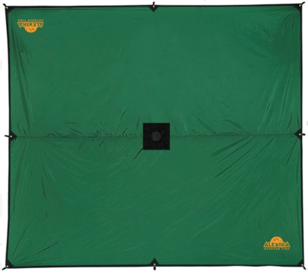 • Середина тента усилена квадратом прочной ткани для установки подпорки в центре, с другой стороны усиливающего квадрата вшита оттяжка для подвешивания центра тента на растяжках