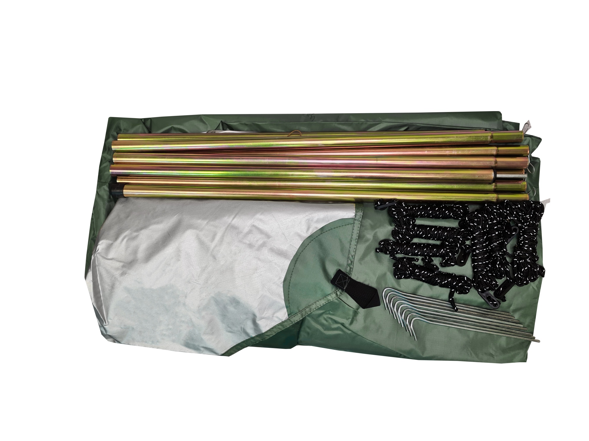 Комплектация: тент, колышки, оттяжки, 2 стальные стойки.