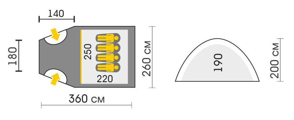 • Размер палатки – 360х260х200 см.