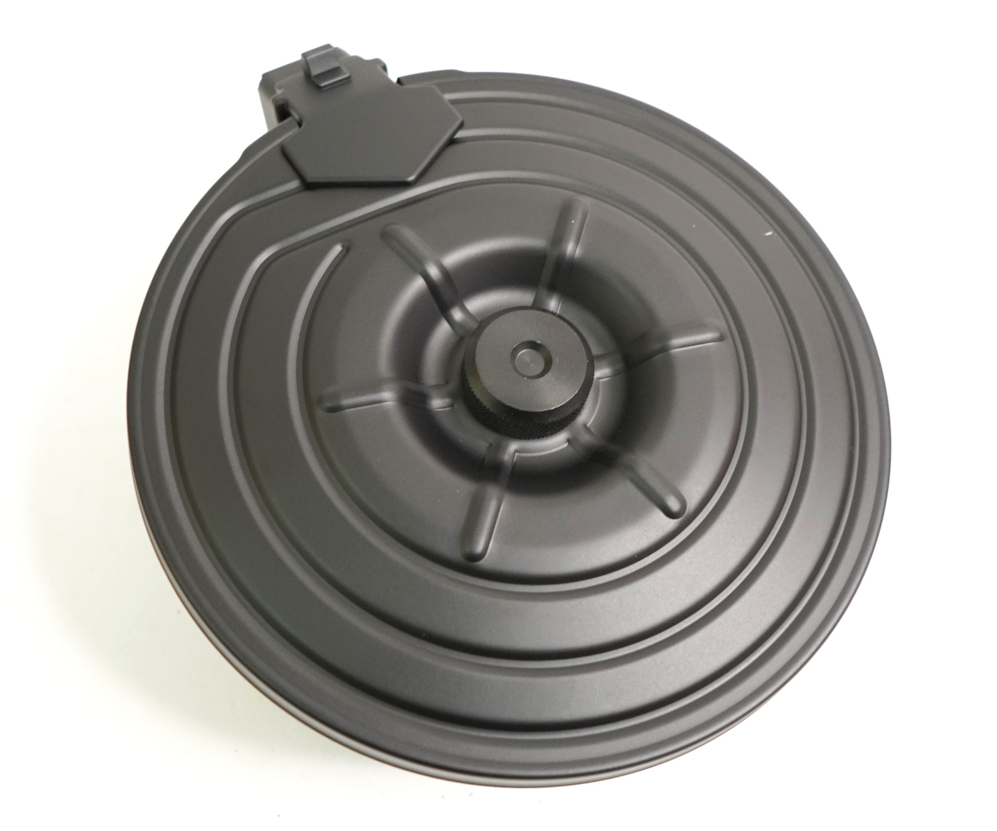 Внешне по форме напоминает усечённый конус. Выполнен в чёрном цвете, из металла, делая магазин очень прочным.