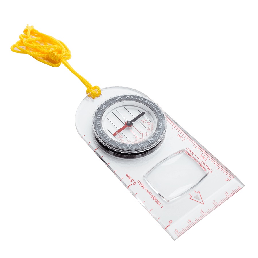 Компас-линейку удобно носить на шее, так как он легкий и оборудован нашейной веревкой. Конструкция прибора со встроенным увеличительным стеклом и масштабные линейки позволяют удобно работать даже с самыми мелкими деталями карт. Диаметр лимба 40 мм.