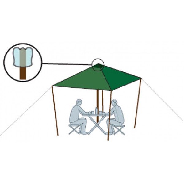 • Середина тента усилена квадратом прочной ткани для установки подпорки в центре, с другой стороны усиливающего квадрата вшита оттяжка для подвешивания центра тента на растяжках