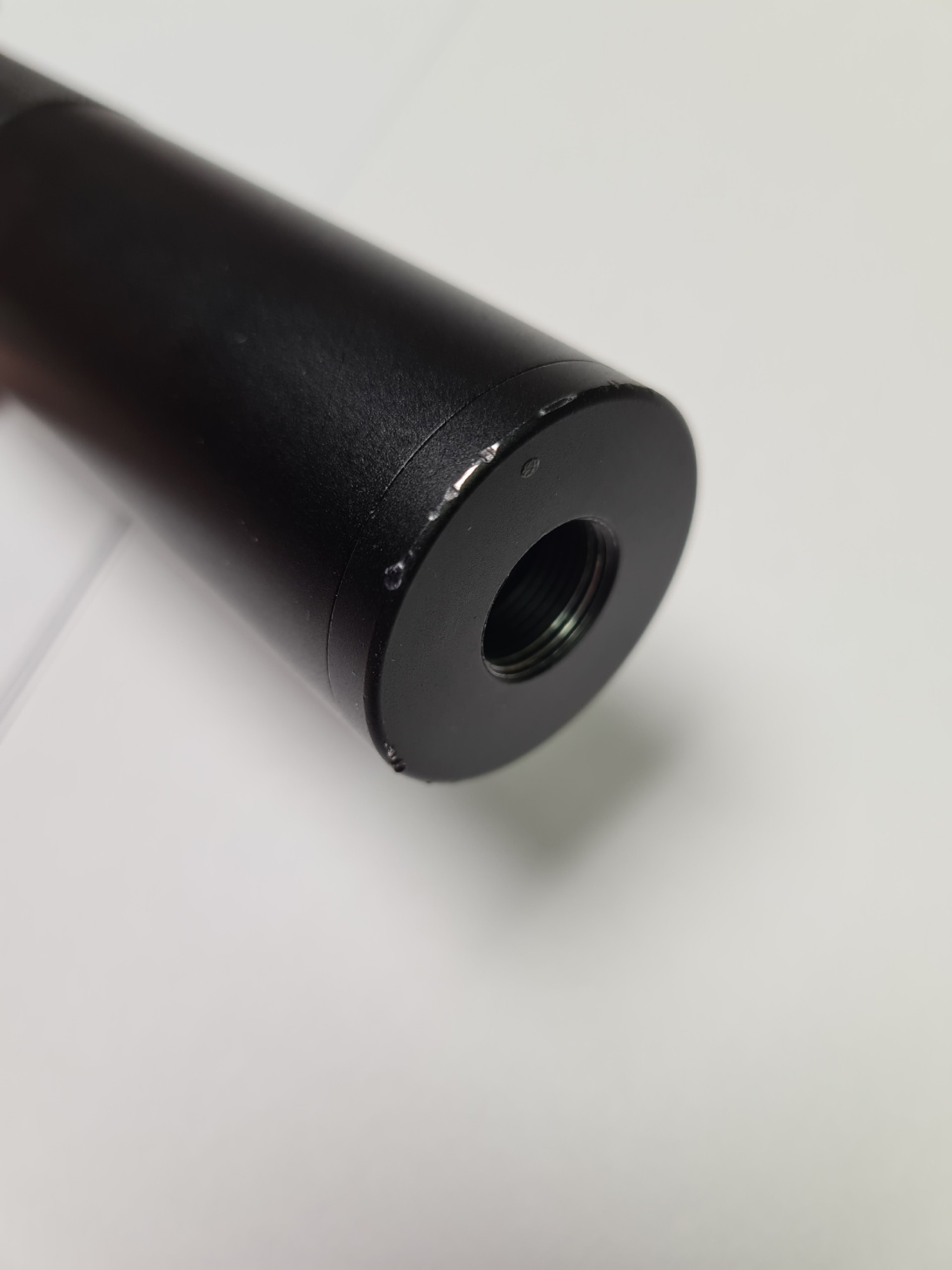 Образец выполнен в гладком корпусе из высокопрочного алюминиевого сплава, длина 200 мм, а внешний диаметр глушителя составляет 36 мм. Устанавливается на стандартную резьбу 14